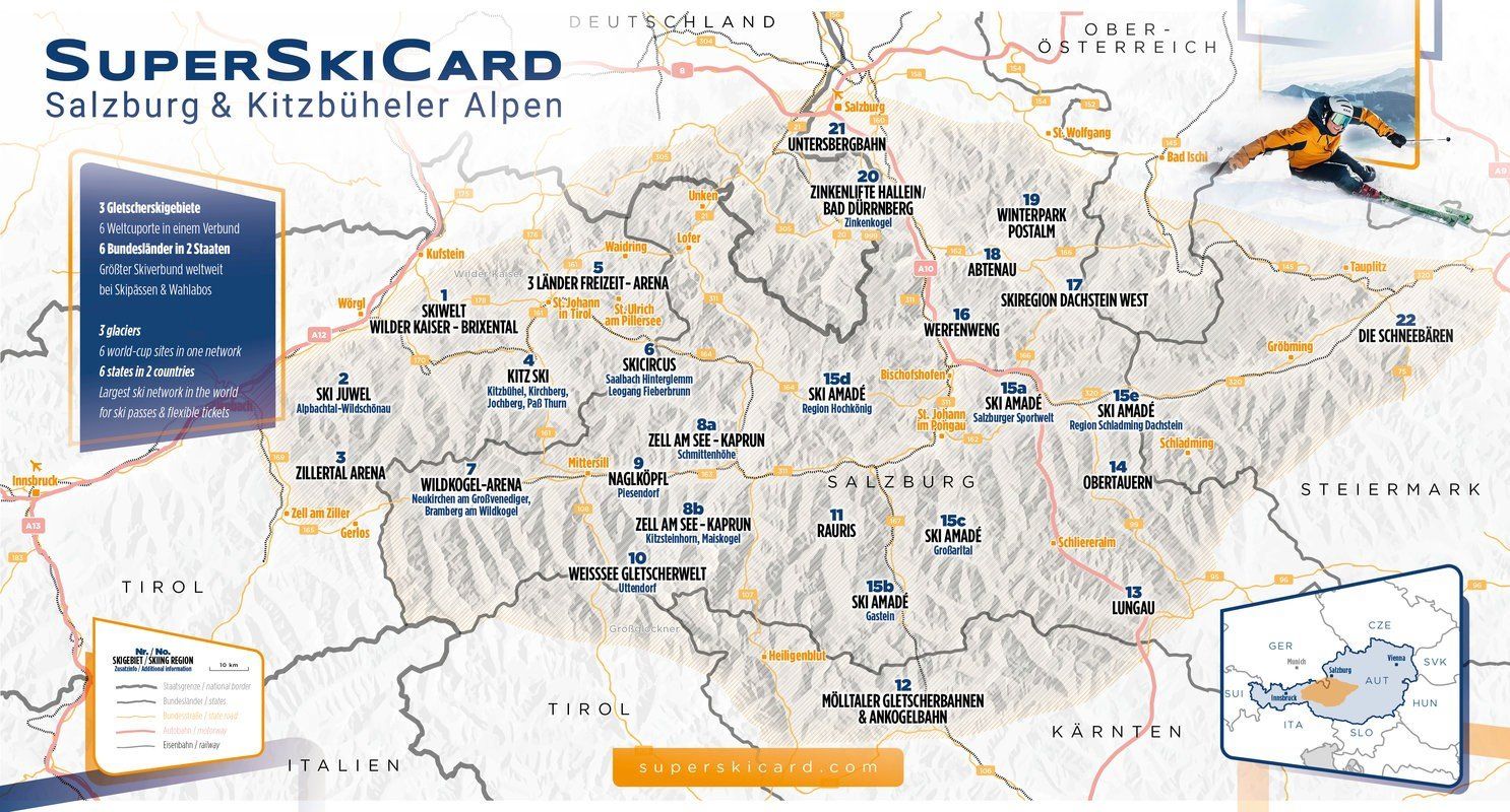 The SuperSkiCard offers 2,840 kilometres of piste, 2,200 of which are snow-covered, and 946 lift systems in two countries and six federal states. With two glaciers - the Kitzsteinhorn and the Mölltal Glacier - the Ultra-Skipass offers 200 days of fun on the slopes and reliability of snow. In addition, 809 huts in Tyrol and Salzburg invite you to celebrate and relax. The 23 ski regions include world-famous ski areas such as the Skicircus Saalbach Hinterglemm Leogang Fieberbrunn, Skiwelt Wilder Kaiser - Brixental, Kitzbühel - Kirchberg, St. Johann in Tirol - Oberndorf, Steinplatte Waidring - Winklmoos, Ski amadé and the Zillertal Arena. A must for every winter sports fan!